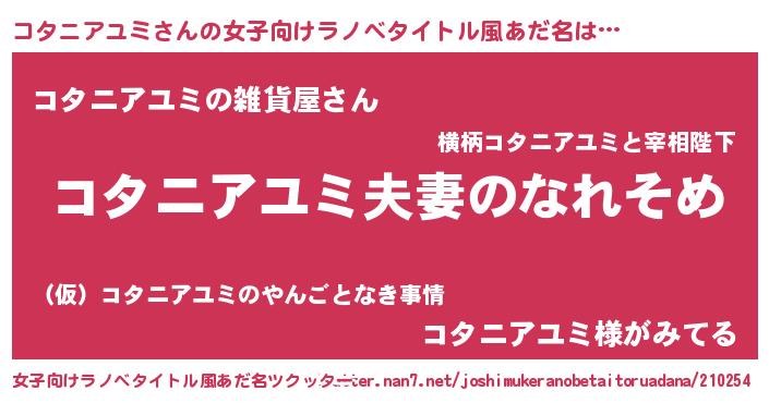 | 男性向けラノベタイトル風あだ名 | 『おまえをオタクにしてやるから、俺をコタニアユミにしてくれ! 』 |