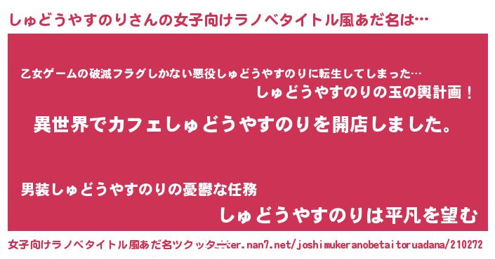 | 男性向けラノベタイトル風あだ名 | 『誰もが恐れるあのしゅどうやすのりが、ぼくの専属メイドになるようです。』 |