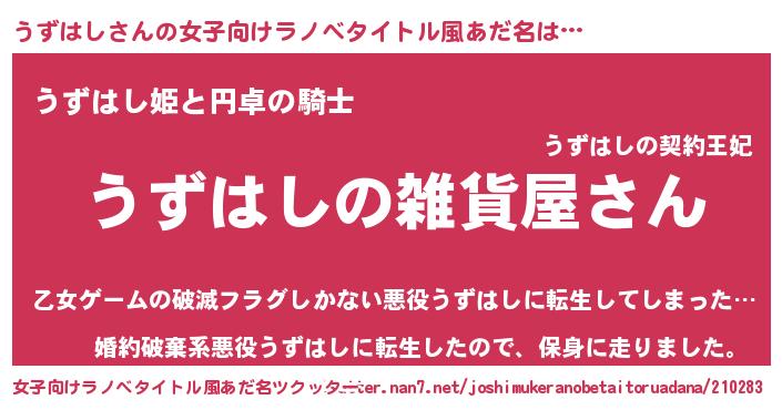 | 男性向けラノベタイトル風あだ名 | 『やはりうずはしの青春ラブコメはまちがっている 』 |
