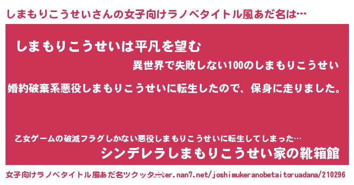 しまもりこうせいさんの女子向けラノベタイトル風あだ名は… 『婚約破棄系悪役しまもりこうせいに転生したので、保身に走りました。』『しまもりこうせいは平凡を望む』『シンデレラしまもりこうせい家の靴箱館』 ツクッター #女子向けラノベタイトル風あだ名ツクッター http://tkutter.nan7.net/joshimukeranobetaitoruadana/210296/
