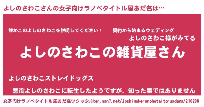 | 男性向けラノベタイトル風あだ名 | 『やはりよしのさわこの青春ラブコメはまちがっている 』 |