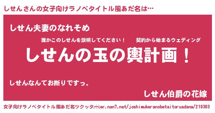 | 男性向けラノベタイトル風あだ名 | 『しせん~年齢イコール彼女いない歴の魔法使い~』 |