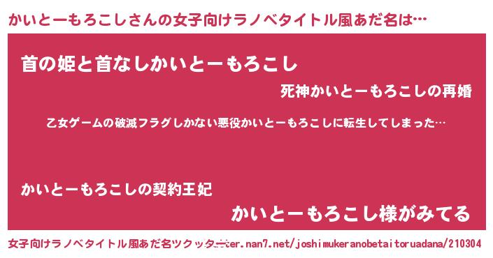 | 男性向けラノベタイトル風あだ名 | 『この素晴らしい世界にかいとーもろこしを!』 |