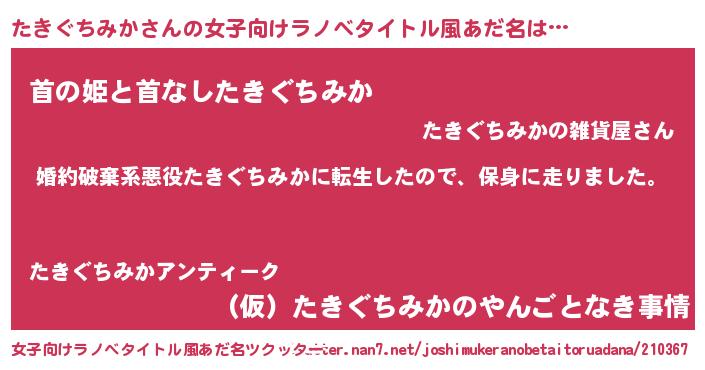 | 男性向けラノベタイトル風あだ名 | 『タキグチミカスレイヤー』 |