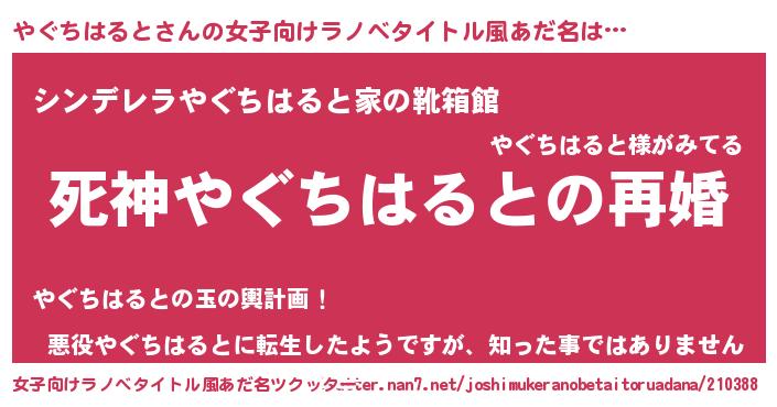 やぐちはるとさんの女子向けラノベタイトル風あだ名は… 『死神やぐちはるとの再婚』『シンデレラやぐちはると家の靴箱館』『悪役やぐちはるとに転生したようですが、知った事ではありません』 ツクッター #女子向けラノベタイトル風あだ名ツクッター http://tkutter.nan7.net/joshimukeranobetaitoruadana/210388/