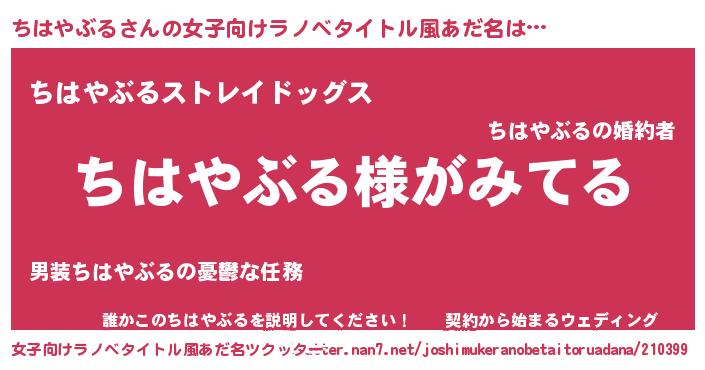 | 男性向けラノベタイトル風あだ名 | 『ちはやぶるの嫁は女の子じゃないと思った?』 |