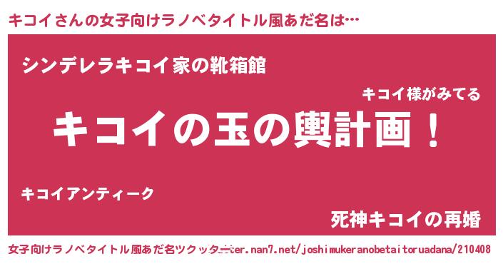 | 男性向けラノベタイトル風あだ名 | 『キコイ~年齢イコール彼女いない歴の魔法使い~』 |