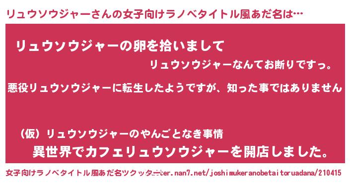 | 男性向けラノベタイトル風あだ名 | 『この素晴らしい世界にリュウソウジャーを!』 |