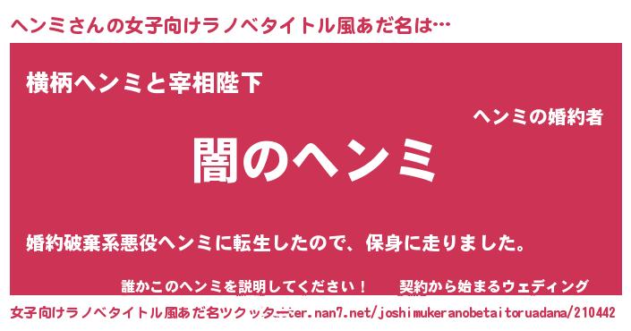 | 男性向けラノベタイトル風あだ名 | 『Re:ヘンミから始める異世界生活』 |
