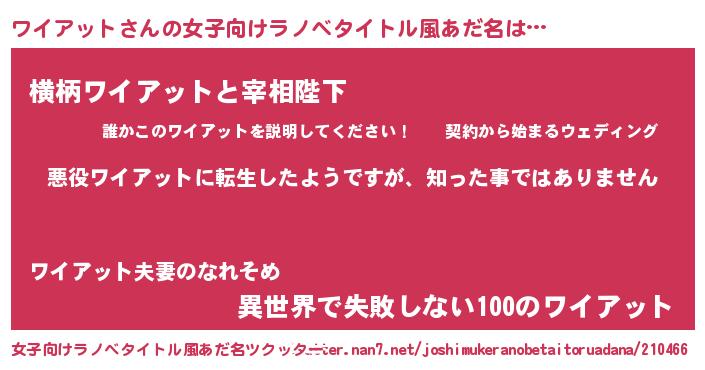 ワイアットさんの女子向けラノベタイトル風あだ名は… 『悪役ワイアットに転生したようですが、知った事ではありません』『横柄ワイアットと宰相陛下』『異世界で失敗しない100のワイアット』 ツクッター #女子向けラノベタイトル風あだ名ツクッター http://tkutter.nan7.net/joshimukeranobetaitoruadana/210466/