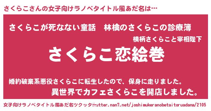 | 男性向けラノベタイトル風あだ名 | 『おまえをオタクにしてやるから、俺をさくらこにしてくれ! 』 |