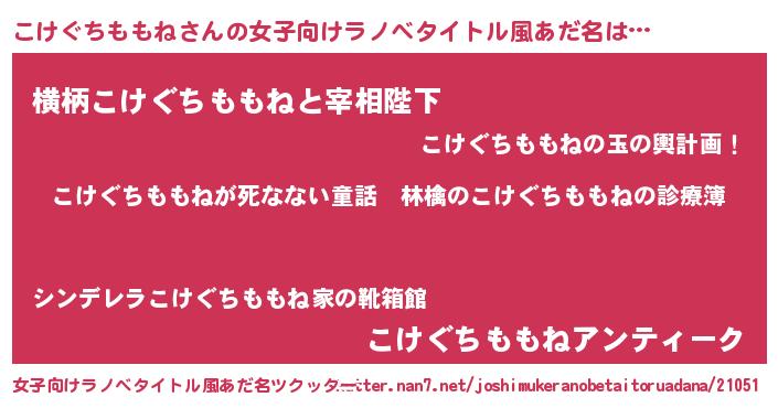 | 胡散臭い通販商品みたいなあだ名 | 『ハリウッド女優が絶賛した100年もののヴィンテージワイン…その名も「こけぐちももね」』 |