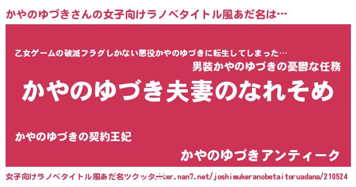 | 男性向けラノベタイトル風あだ名 | 『おまえをオタクにしてやるから、俺をかやのゆづきにしてくれ! 』 |