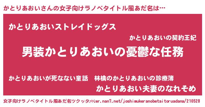 | 男性向けラノベタイトル風あだ名 | 『うちのかとりあおいが世界を掌握している!』 |