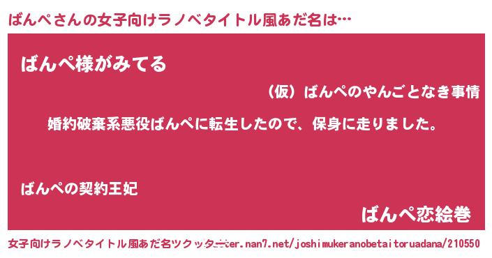 | 男性向けラノベタイトル風あだ名 | 『バンペスレイヤー』『ばんぺの憂鬱』 |