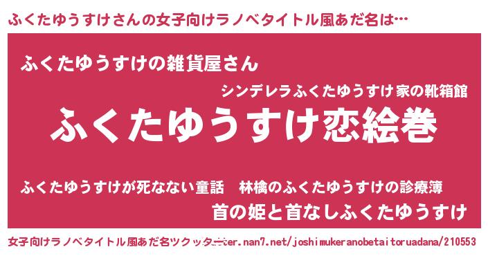 | 男性向けラノベタイトル風あだ名 | 『おまえをオタクにしてやるから、俺をふくたゆうすけにしてくれ! 』 |