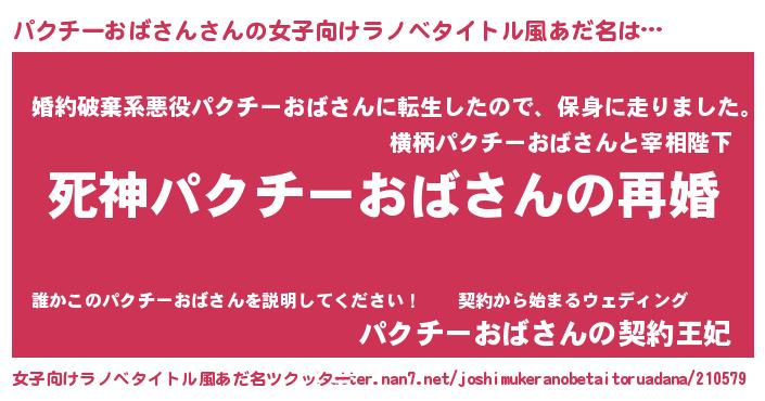 | 男性向けラノベタイトル風あだ名 | 『ノーゲーム・ノーパクチーオバサン』 |