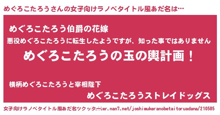 | 男性向けラノベタイトル風あだ名 | 『めぐろこたろう~年齢イコール彼女いない歴の魔法使い~』 |