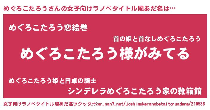 | 男性向けラノベタイトル風あだ名 | 『めぐろこたろうの嫁は女の子じゃないと思った?』 |