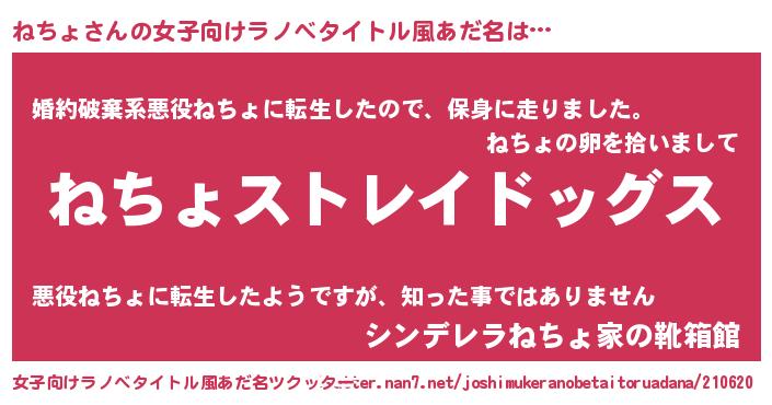 | 男性向けラノベタイトル風あだ名 | 『Re:ねちょから始める異世界生活』 |