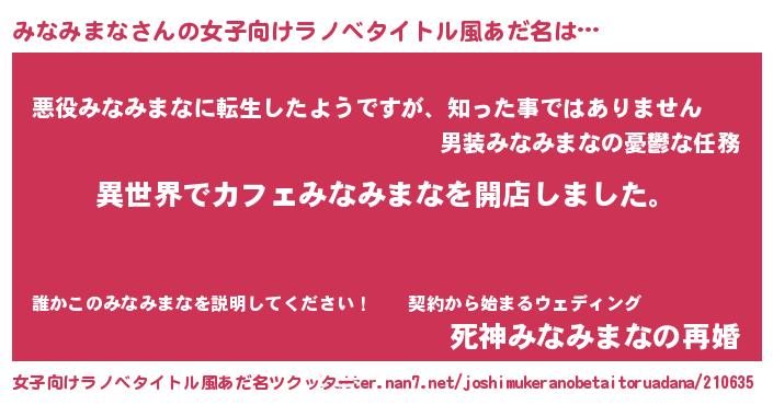 | 男性向けラノベタイトル風あだ名 | 『誰もが恐れるあのみなみまなが、ぼくの専属メイドになるようです。』 |