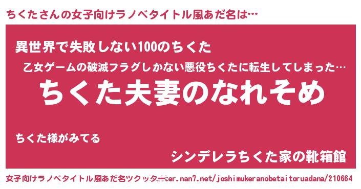 | 男性向けラノベタイトル風あだ名 | 『おまえをオタクにしてやるから、俺をちくたにしてくれ! 』 |