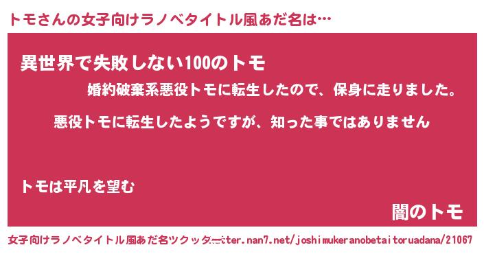 | 男性向けラノベタイトル風あだ名 | 『この素晴らしい世界にトモを!』 |