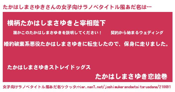 | 男性向けラノベタイトル風あだ名 | 『転生したらたかはしまさゆきだった件』 |