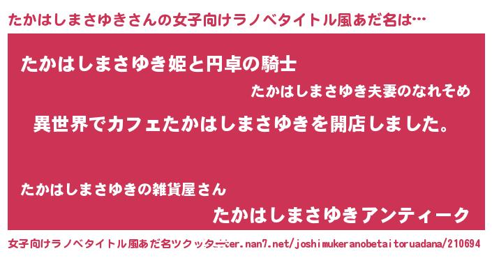 | 男性向けラノベタイトル風あだ名 | 『誰もが恐れるあのたかはしまさゆきが、ぼくの専属メイドになるようです。』 |