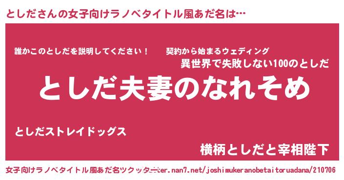 | 男性向けラノベタイトル風あだ名 | 『おまえをオタクにしてやるから、俺をとしだにしてくれ! 』 |