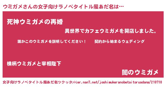 | 男性向けラノベタイトル風あだ名 | 『ウミガメアートオンライン』 |