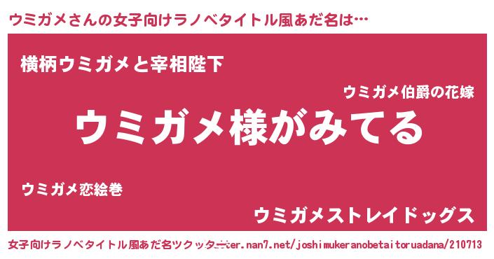 | 男性向けラノベタイトル風あだ名 | 『ウミガメの嫁は女の子じゃないと思った?』 |