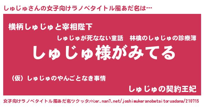 | 男性向けラノベタイトル風あだ名 | 『しゅじゅの嫁は女の子じゃないと思った?』 |