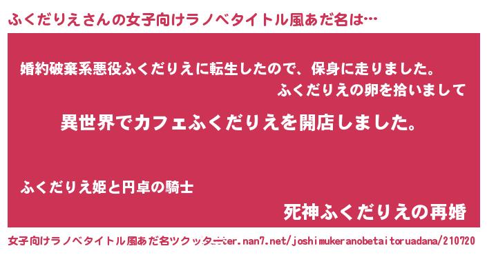 | 男性向けラノベタイトル風あだ名 | 『誰もが恐れるあのふくだりえが、ぼくの専属メイドになるようです。』 |
