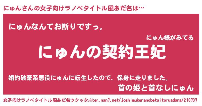 | 男性向けラノベタイトル風あだ名 | 『にゅんという概念が存在しない退屈な世界 』 |