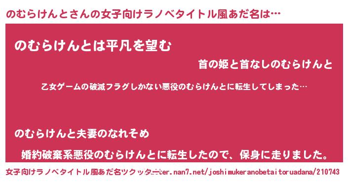 | 男性向けラノベタイトル風あだ名 | 『魔弾の王とのむらけんと』 |