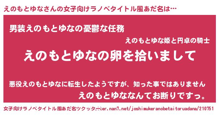 | 男性向けラノベタイトル風あだ名 | 『ダンジョンにえのもとゆなを求めるのは間違っているだろうか』 |