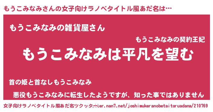 もうこみなみさんの女子向けラノベタイトル風あだ名は… 『もうこみなみは平凡を望む』『もうこみなみの雑貨屋さん』『悪役もうこみなみに転生したようですが、知った事ではありません』 ツクッター #女子向けラノベタイトル風あだ名ツクッター http://tkutter.nan7.net/joshimukeranobetaitoruadana/210769/