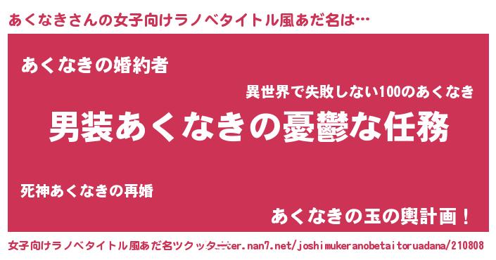 | 男性向けラノベタイトル風あだ名 | 『うちのあくなきが世界を掌握している!』 |