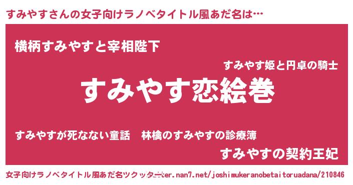 | 男性向けラノベタイトル風あだ名 | 『おまえをオタクにしてやるから、俺をすみやすにしてくれ! 』 |