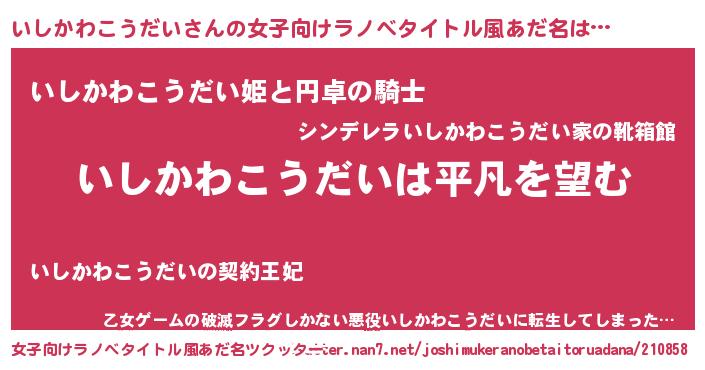 | 男性向けラノベタイトル風あだ名 | 『ダンジョンにいしかわこうだいを求めるのは間違っているだろうか』 |