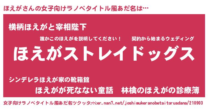 | 男性向けラノベタイトル風あだ名 | 『Re:ほえがから始める異世界生活』 |