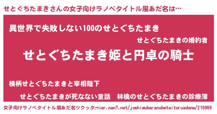 せとぐちたまきさんの女子向けラノベタイトル風あだ名は… 『せとぐちたまき姫と円卓の騎士』『異世界で失敗しない100のせとぐちたまき』『せとぐちたまきが死なない童話 林檎のせとぐちたまきの診療簿』 ツクッター #女子向けラノベタイトル風あだ名ツクッター http://tkutter.nan7.net/joshimukeranobetaitoruadana/210909/