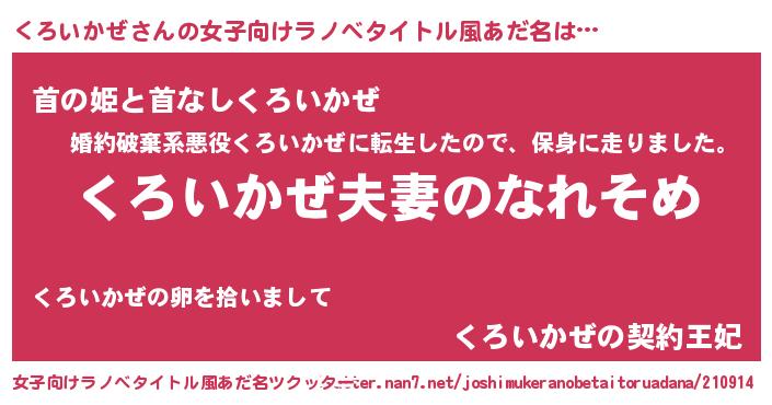 | 男性向けラノベタイトル風あだ名 | 『おまえをオタクにしてやるから、俺をくろいかぜにしてくれ! 』 |
