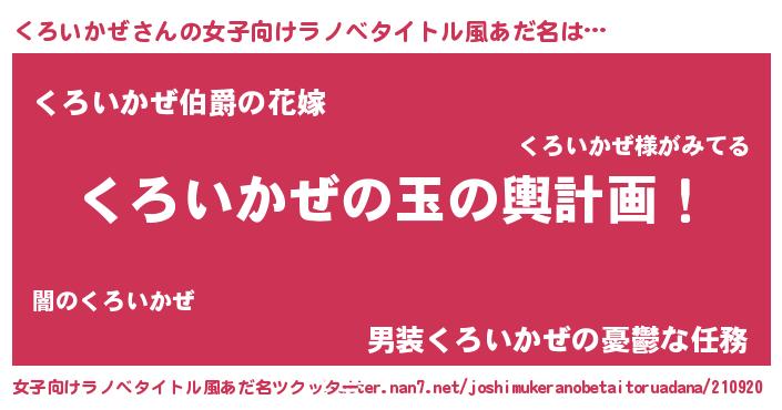| 男性向けラノベタイトル風あだ名 | 『くろいかぜ~年齢イコール彼女いない歴の魔法使い~』 |