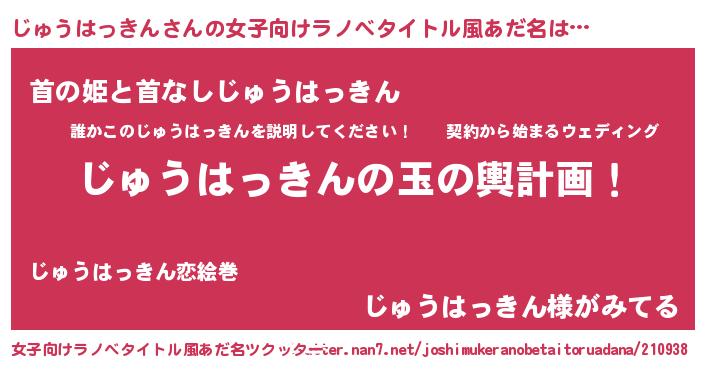 | 男性向けラノベタイトル風あだ名 | 『じゅうはっきん~年齢イコール彼女いない歴の魔法使い~』 |