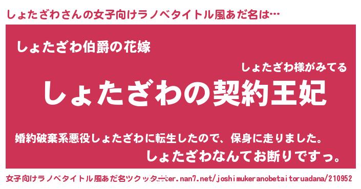 | 男性向けラノベタイトル風あだ名 | 『しょたざわという概念が存在しない退屈な世界 』 |