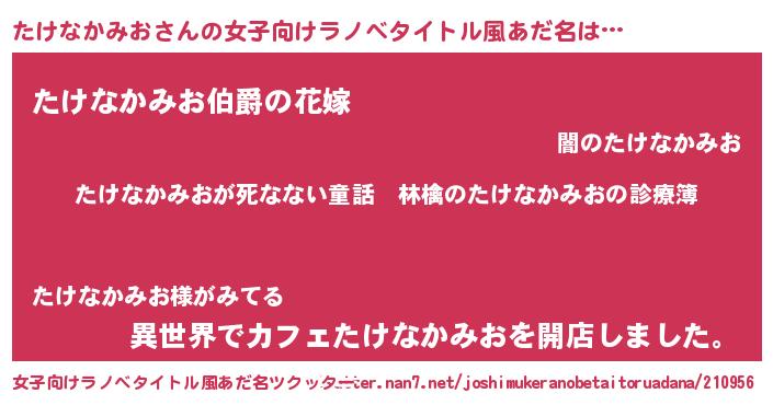 | 男性向けラノベタイトル風あだ名 | 『魔弾の王とたけなかみお』 |
