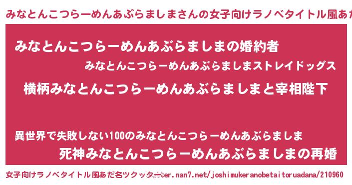 | 男性向けラノベタイトル風あだ名 | 『みなとんこつらーめんあぶらましまに滅ぼされるだけの簡単なお仕事です』 |