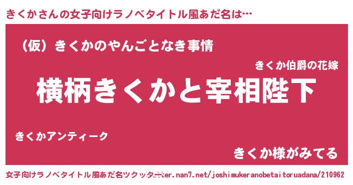 | 男性向けラノベタイトル風あだ名 | 『きくかに滅ぼされるだけの簡単なお仕事です』 |